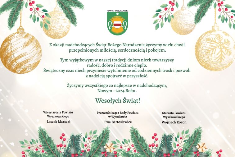 Z okazji nadchodzących Świąt Bożego Narodzenia życzymy wielu chwil przepełnionych miłością, serdecznością i pokojem. Tym wyjątkowym w naszej tradycji dniom niech towarzyszy radość, dobro i rodzinne ciepło. Świąteczny czas niech przyniesie wytchnienie od codziennych trosk i pozwoli z nadzieją spojrzeć w przyszłość. Życzymy wszystkiego co najlepsze w nadchodzącym, Nowym - 2024 Roku.